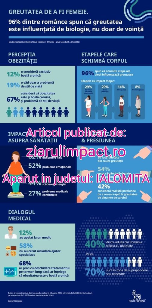 Două treimi dintre femeile din România consideră că obezitatea este atât o boală cronică, cât și o problemă de stil de viață, iar aproape toate recunosc influența decisivă a etapelor biologice asupra greutății corporale. Potrivit unui studiu realizat la inițiativa Novo Nordisk România, 96% dintre respondente afirmă că, în perioade precum sarcina, etapa postnatală, premenopauza sau menopauza, greutatea este determinată nu doar de voință, ci și de factori biologici. Datele vin într-un context alarmant. Conform Atlasul Obezității, aproximativ 40% dintre adulții din România suferă de obezitate, iar peste 70% se află în zona de suprapondere sau obezitate. Aceste cifre plasează obezitatea printre cele mai serioase provocări actuale de sănătate publică.În spatele statisticilor se află experiențe personale pe care milioane de femei le recunosc imediat. Pentru 95,8% dintre participantele la studiu, sarcina, lunile de după naștere și schimbările hormonale din premenopauză sau menopauză reprezintă puncte de cotitură în relația cu propria greutate. Corpul se transformă, metabolismul reacționează diferit, iar controlul asupra kilogramelor nu mai depinde exclusiv de disciplină. Sarcina, perioada postnatală și stresul prelungit sunt identificate drept etapele cu cel mai mare impact asupra greutății corporale. Deși multe femei declară că sunt informate în privința obezității ca boală cronică, nevoia unei opinii medicale rămâne puternică. 68% dintre respondente afirmă că ar privi cu deschidere un tratament pe termen lung, în condițiile în care ar înțelege că obezitatea necesită intervenție medicală susținută. Silviu Apostol, Director External Affairs în cadrul Novo Nordisk România, subliniază că obezitatea nu este o simplă problemă de voință, ci o boală cronică influențată în proporție de 40–70% de moștenirea genetică. În opinia sa, amploarea fenomenului impune politici publice coerente, educație și acces la soluții terapeutice adecvate.